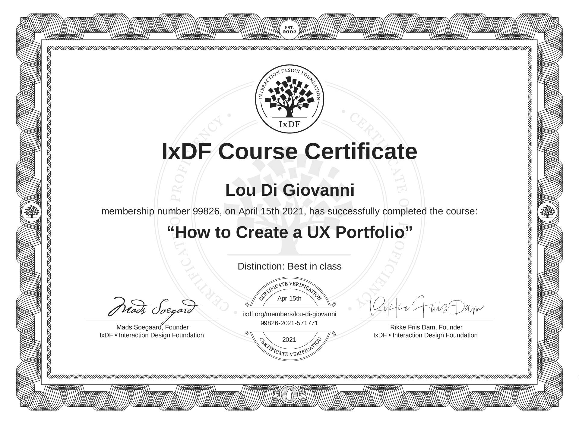 The IxDF Course Certificate (ID #0bd5c52c-e29c-4744-a4f7-75d5355a1bcd) above is awarded to Lou Di Giovanni