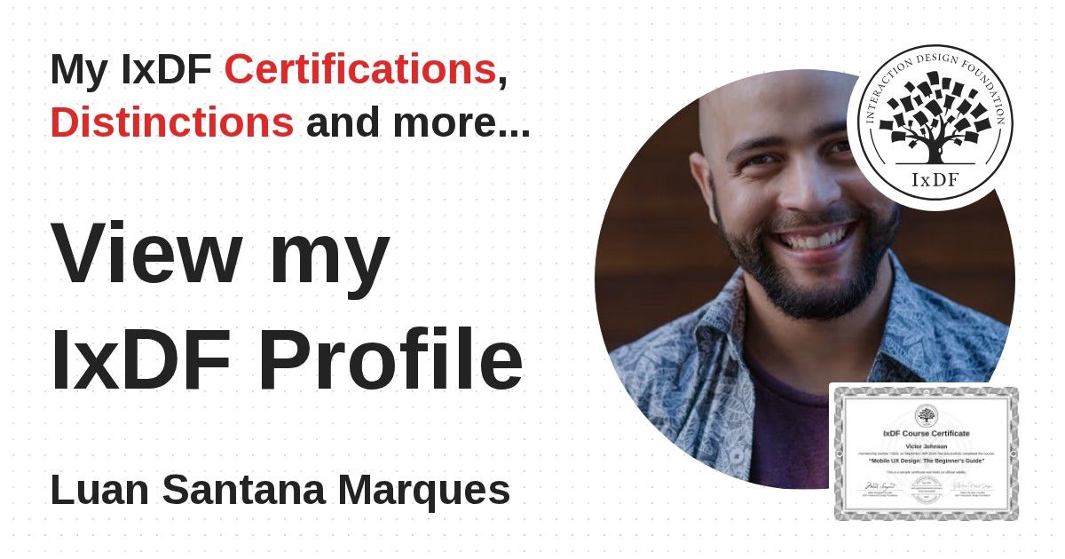 IxDF Course Certificates are awarded to Luan Santana Marques in formal recognition of their coursework surpassing the rigorous benchmarks of exceptional performance established by the IxDF Educational Codex.