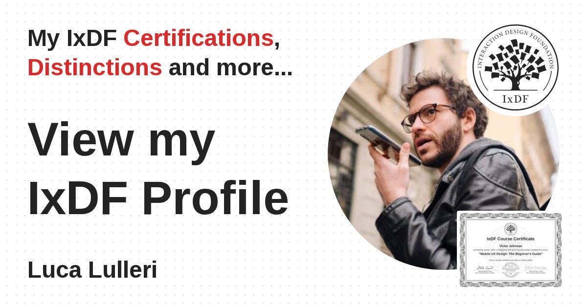 IxDF Course Certificates are awarded to Luca Lulleri in formal recognition of their coursework surpassing the rigorous benchmarks of exceptional performance established by the IxDF Educational Codex.