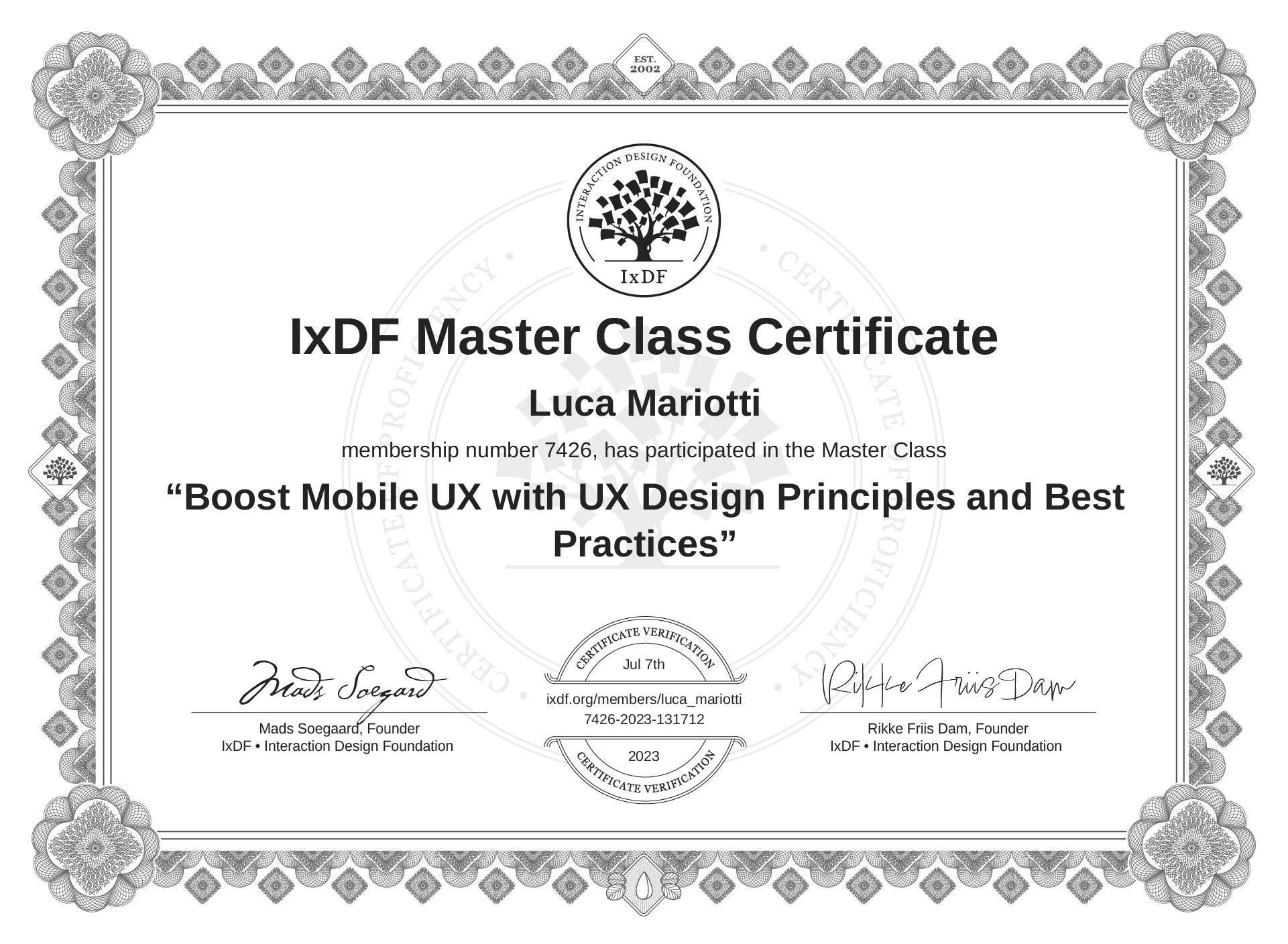 The IxDF Master Class Certificate (ID #mcc_a14620be027c48f7a5819f6b44abac36) above is awarded to Luca Mariotti in formal recognition of their participation in the Master Class Boost Mobile UX with UX Design Principles and Best Practices .