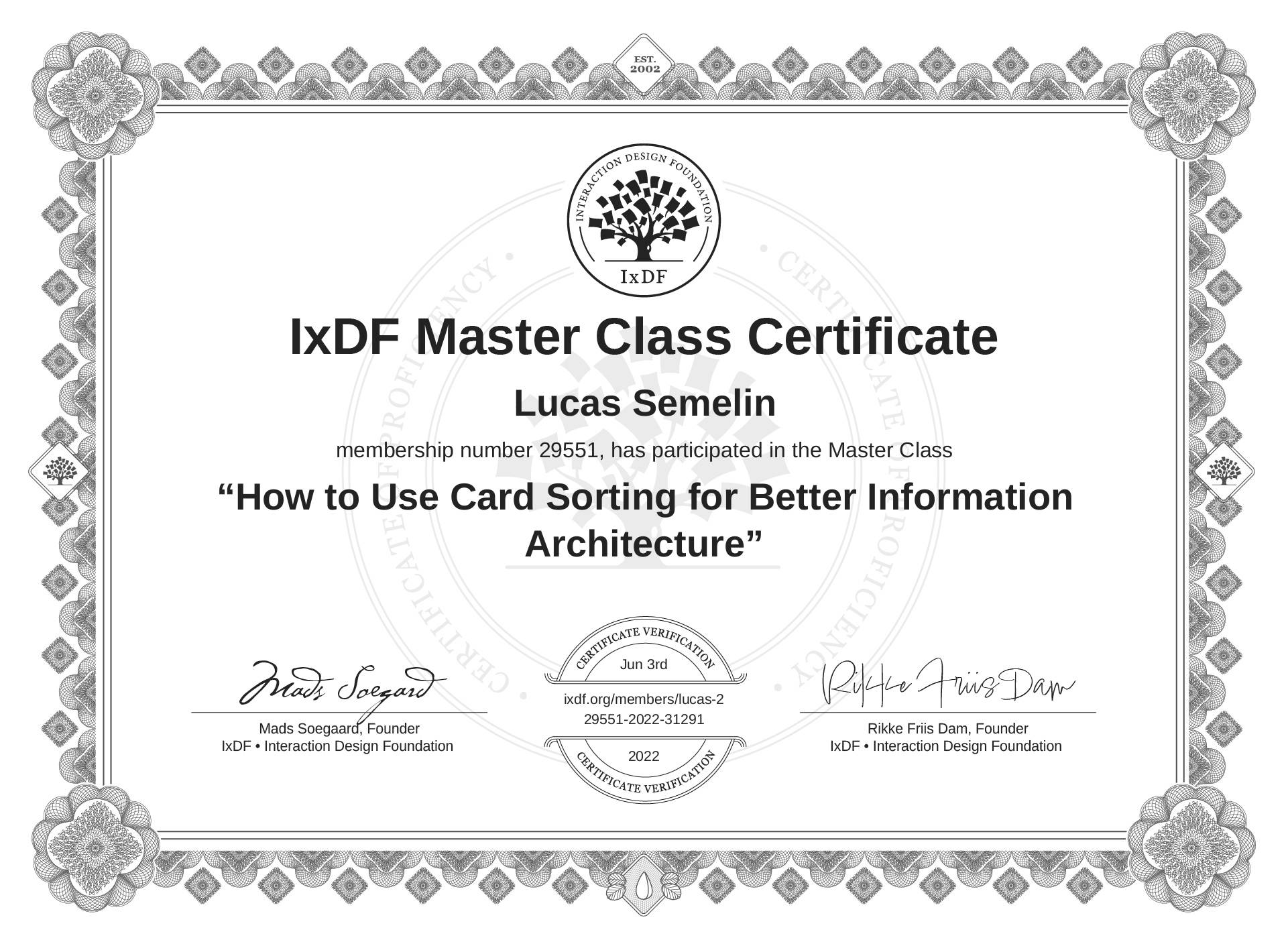 The IxDF Master Class Certificate (ID #mcc_3446f015336a4575881acc2d36533c53) above is awarded to Lucas Semelin in formal recognition of their participation in the Master Class How to Use Card Sorting for Better Information Architecture .