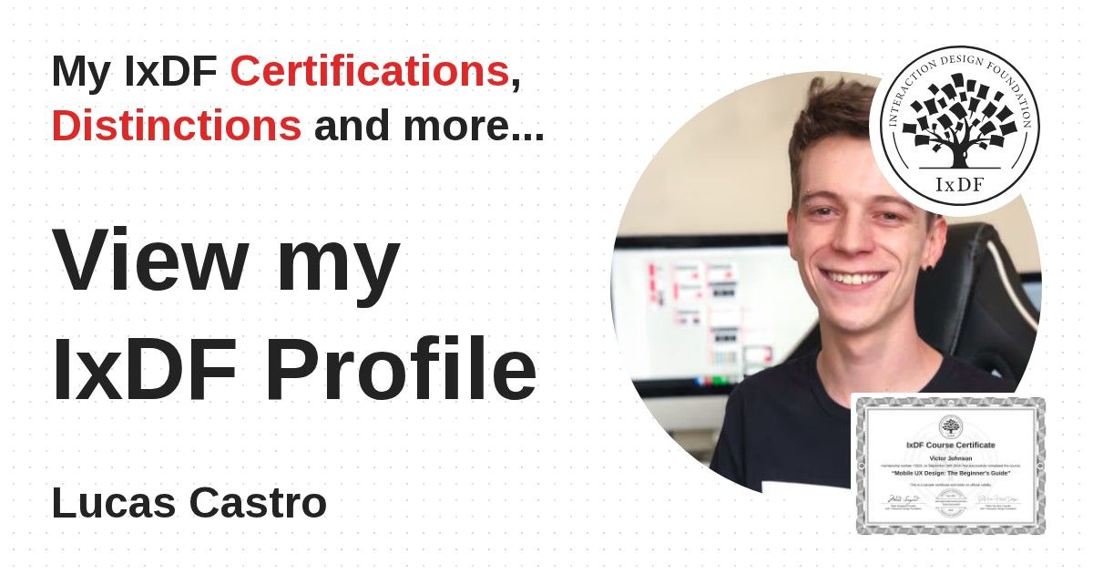 IxDF Course Certificates are awarded to Lucas Castro in formal recognition of their coursework surpassing the rigorous benchmarks of exceptional performance established by the IxDF Educational Codex.