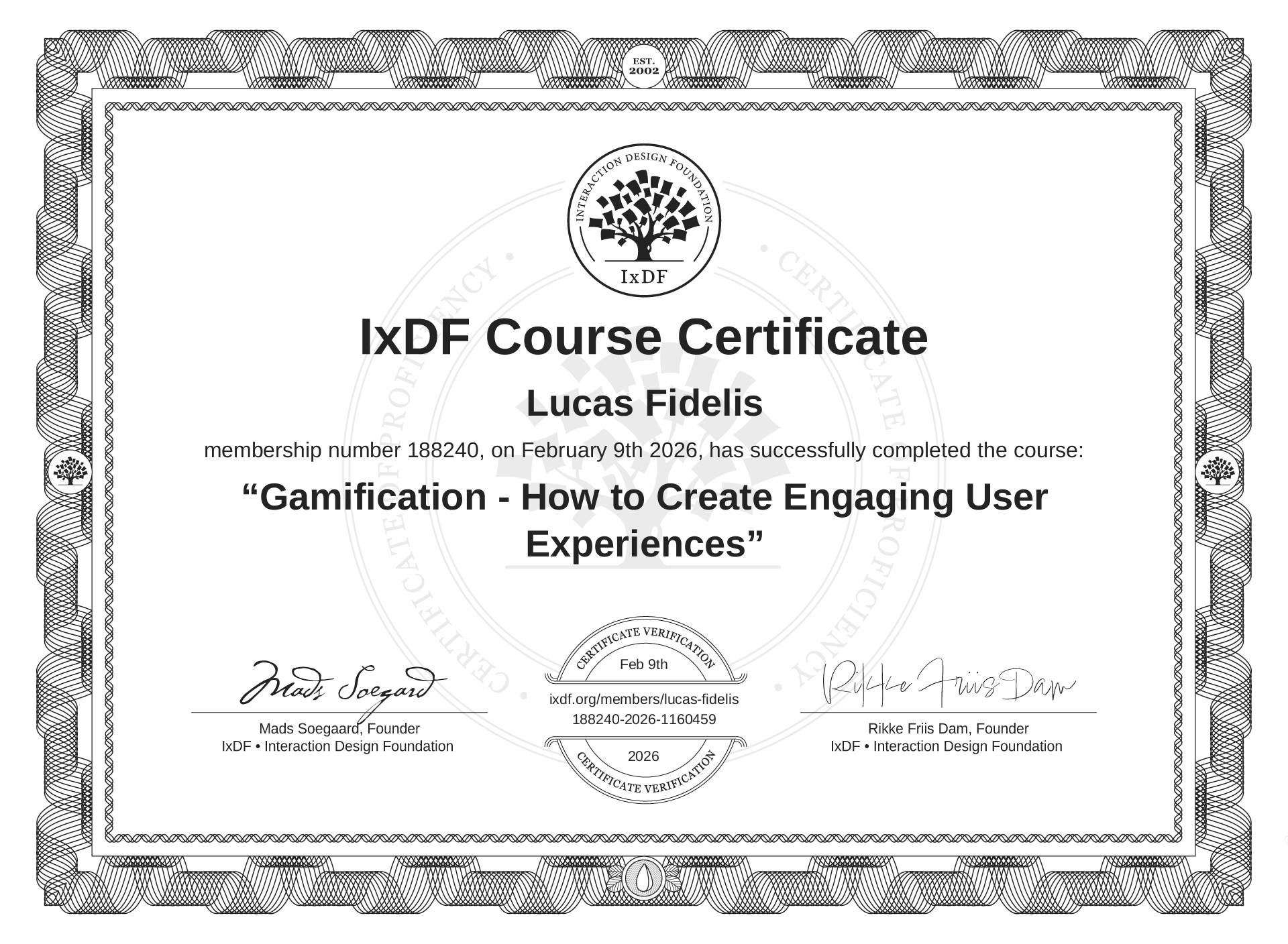 IxDF Course Certificate awarded to Lucas Fidelis for completing the "Gamification - How to Create Engaging User Experiences" course