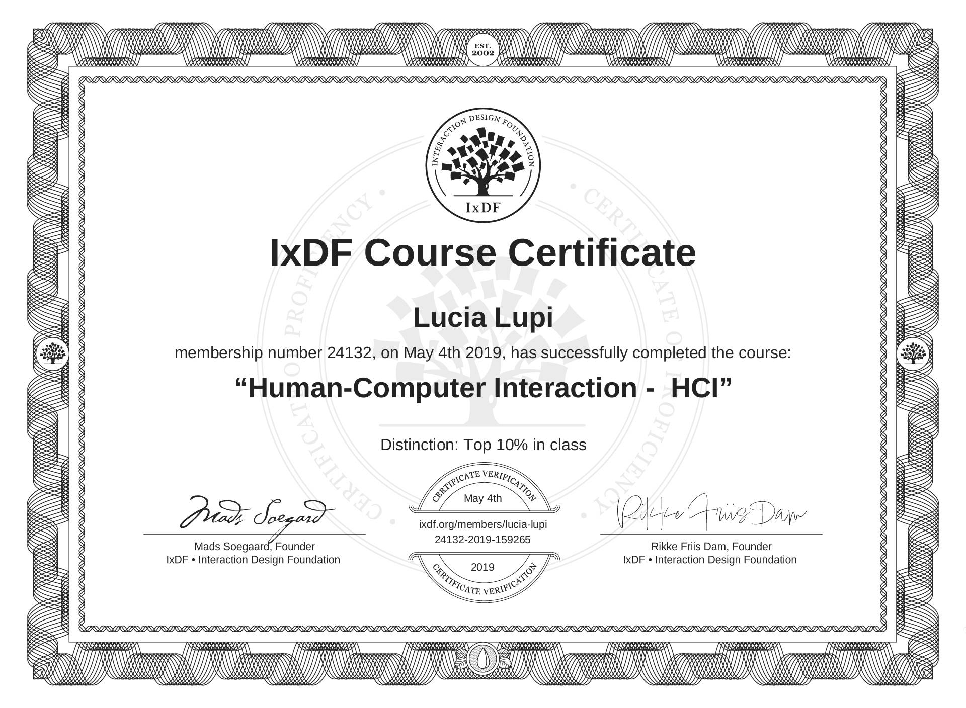 The IxDF Course Certificate (ID #PMLgG6h3j) above is awarded to Lucia Lupi