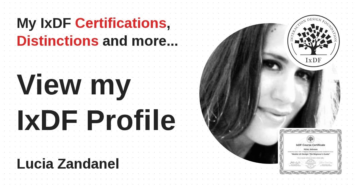 IxDF Course Certificates are awarded to Lucia Zandanel in formal recognition of their coursework surpassing the rigorous benchmarks of exceptional performance established by the IxDF Educational Codex.