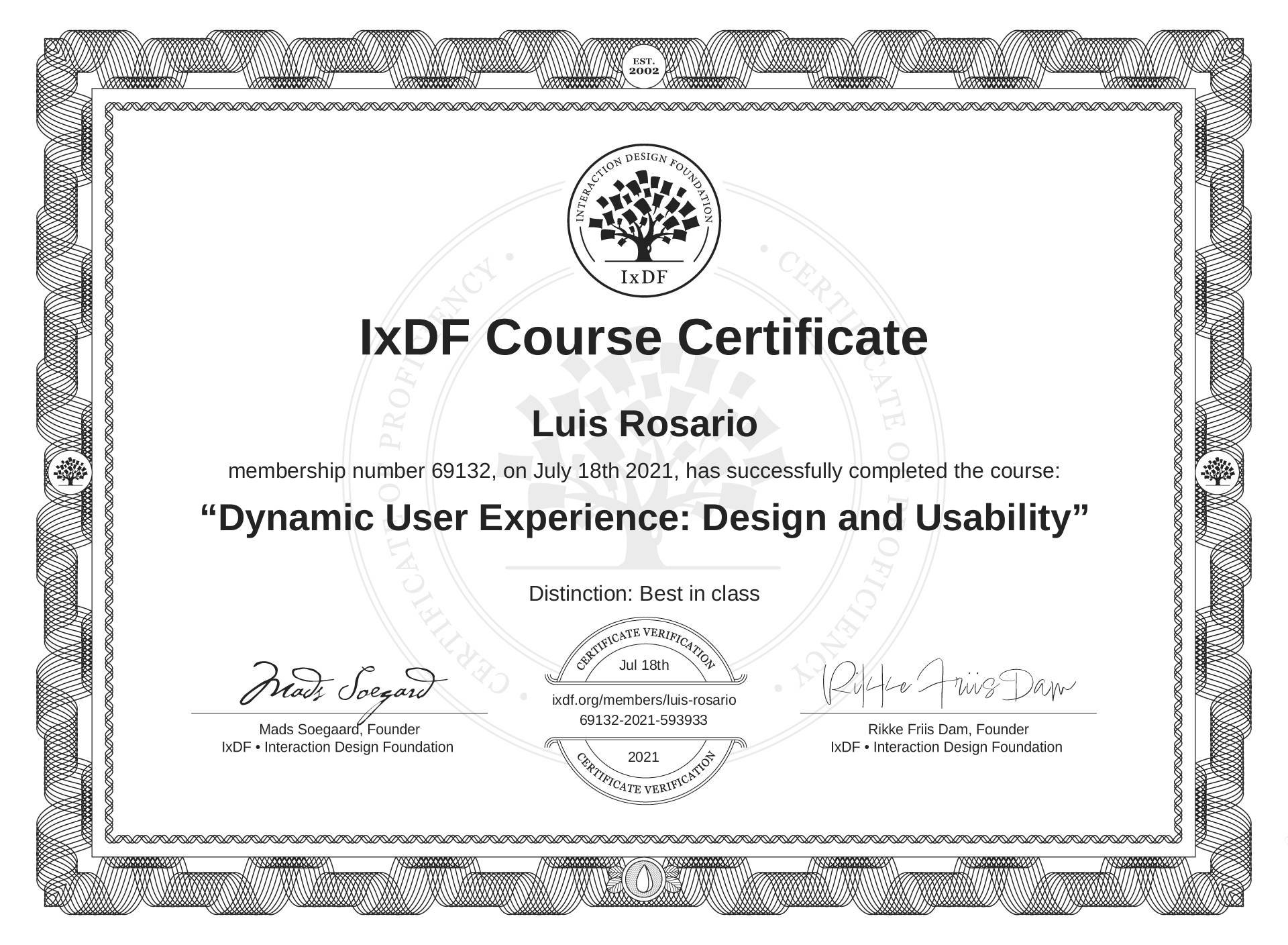 The IxDF Course Certificate (ID #01df10b7-92cd-4b7e-8b1f-f525a49e86ef) above is awarded to Luis Rosario