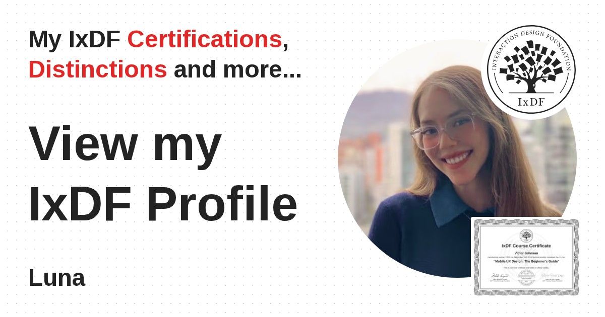 IxDF Course Certificates are awarded to Luna in formal recognition of their coursework surpassing the rigorous benchmarks of exceptional performance established by the IxDF Educational Codex.