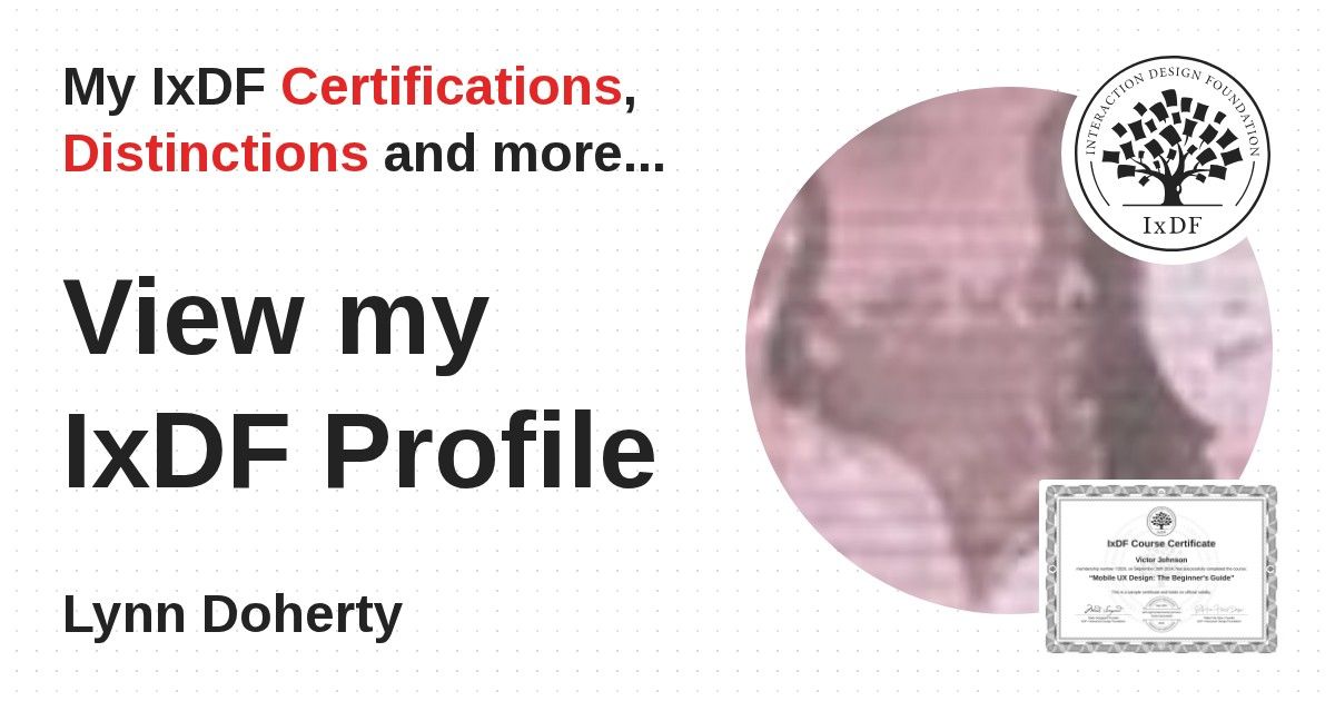 IxDF Course Certificates are awarded to Lynn Doherty in formal recognition of their coursework surpassing the rigorous benchmarks of exceptional performance established by the IxDF Educational Codex.