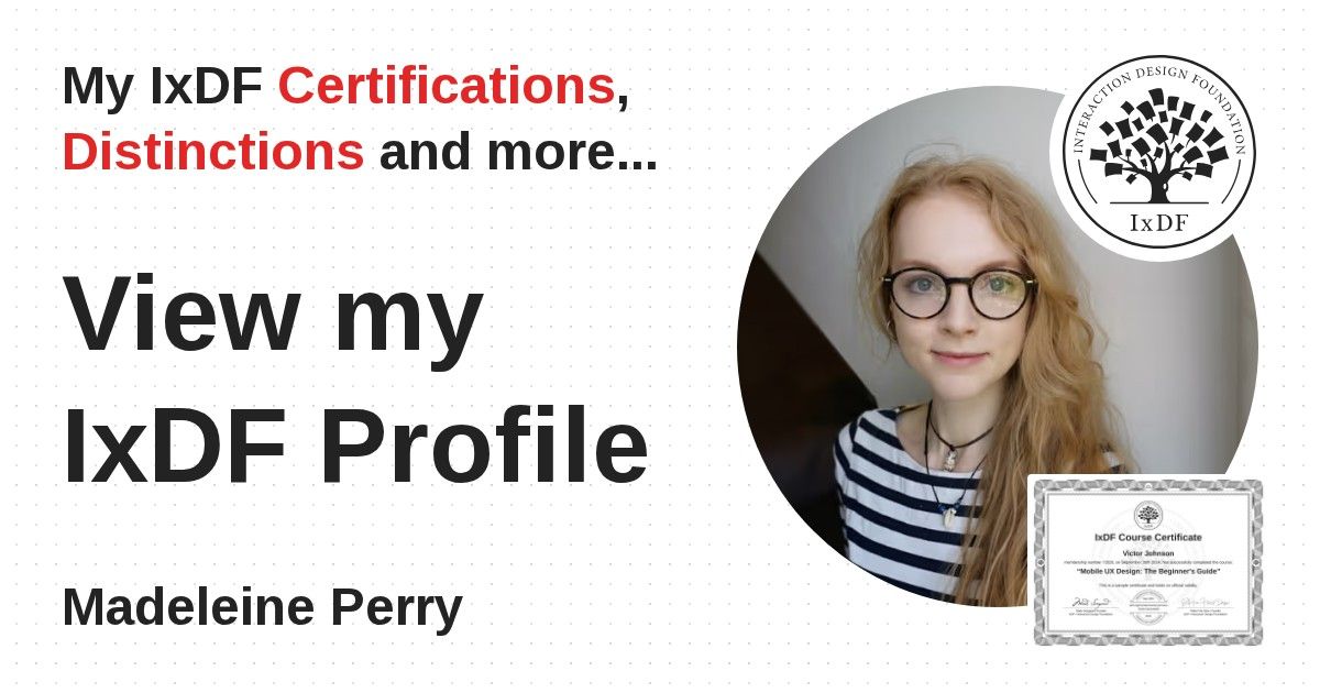 Distinctions are conferred upon Madeleine Perry in formal recognition of their notable achievements and contributions, as stipulated by the IxDF Educational Codex.