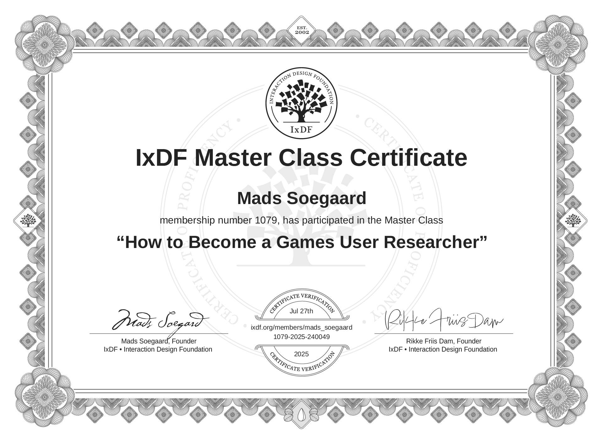 IxDF Master Class Certificates are awarded to Mads Soegaard in formal recognition of their attendance and ongoing commitment to learning from industry leaders.