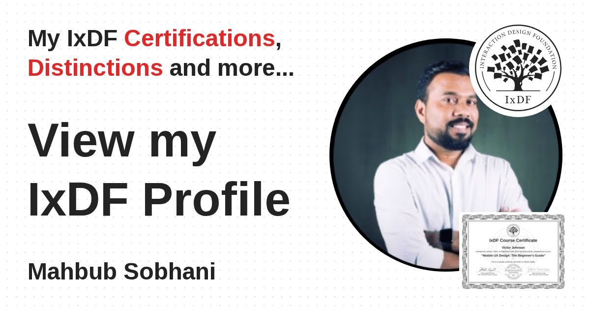 IxDF Course Certificates are awarded to Mahbub Sobhani in formal recognition of their coursework surpassing the rigorous benchmarks of exceptional performance established by the IxDF Educational Codex.