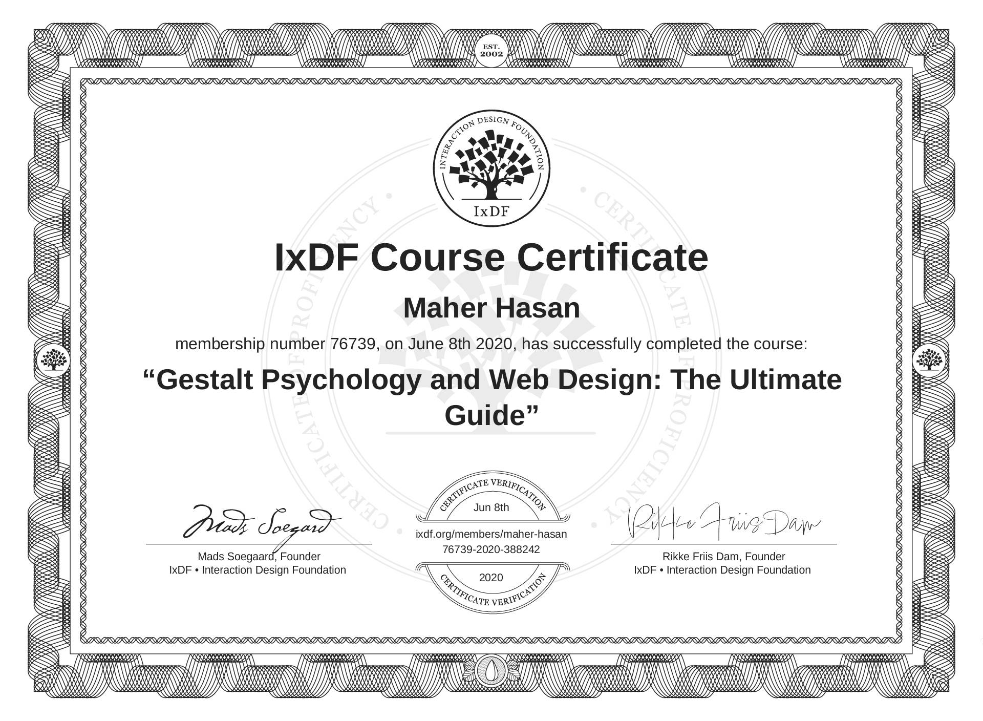 IxDF Course Certificate awarded to Maher Hasan for completing the "Gestalt Psychology and Web Design: The Ultimate Guide" course