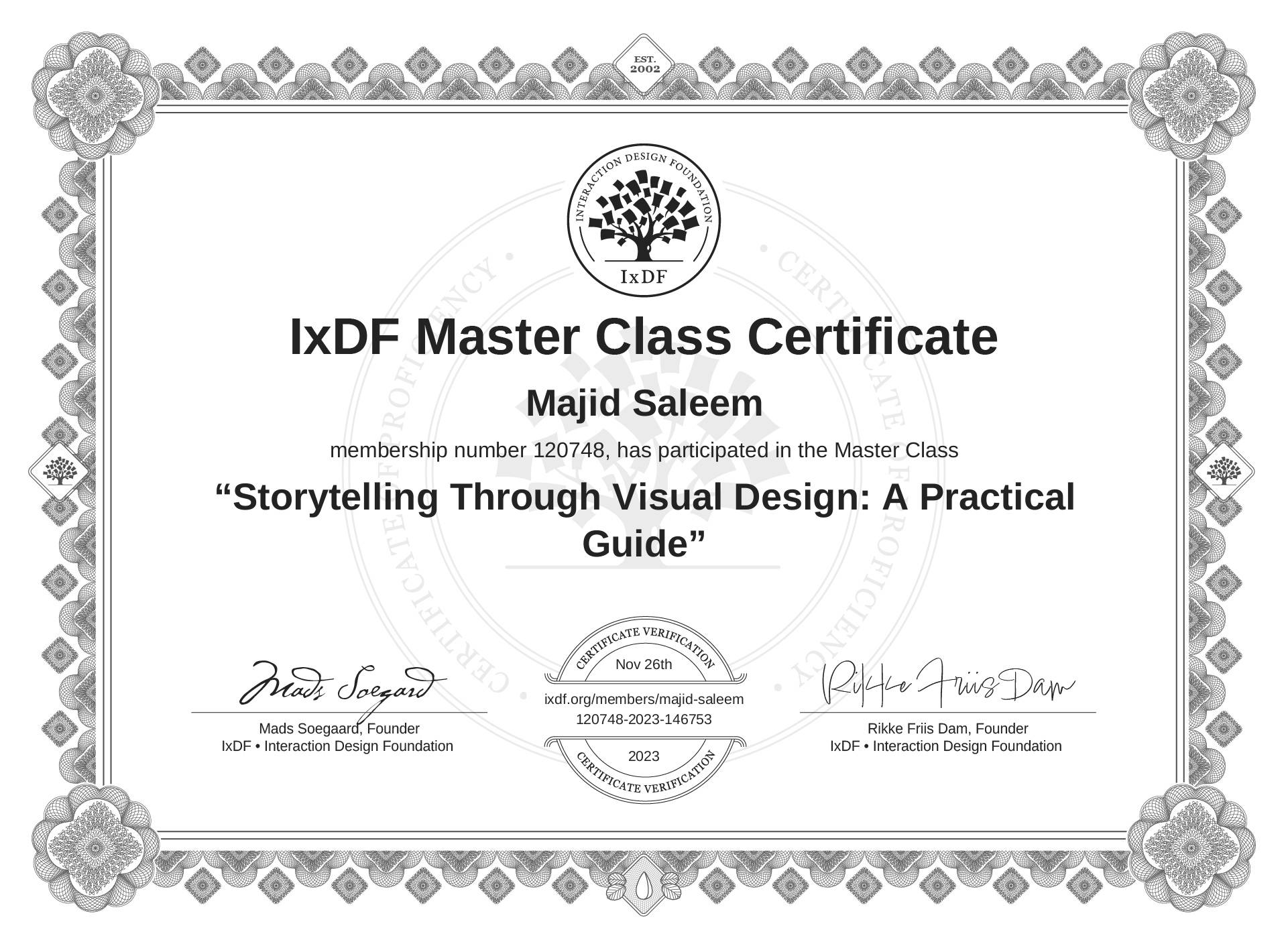 The IxDF Master Class Certificate (ID #mcc_e350672b57eb43e59258dc2a4d9f9e5b) above is awarded to Majid Saleem in formal recognition of their participation in the Master Class Storytelling Through Visual Design: A Practical Guide .