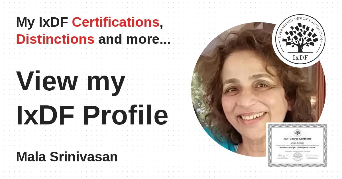 IxDF Course Certificates are awarded to Mala Srinivasan in formal recognition of their coursework surpassing the rigorous benchmarks of exceptional performance established by the IxDF Educational Codex.