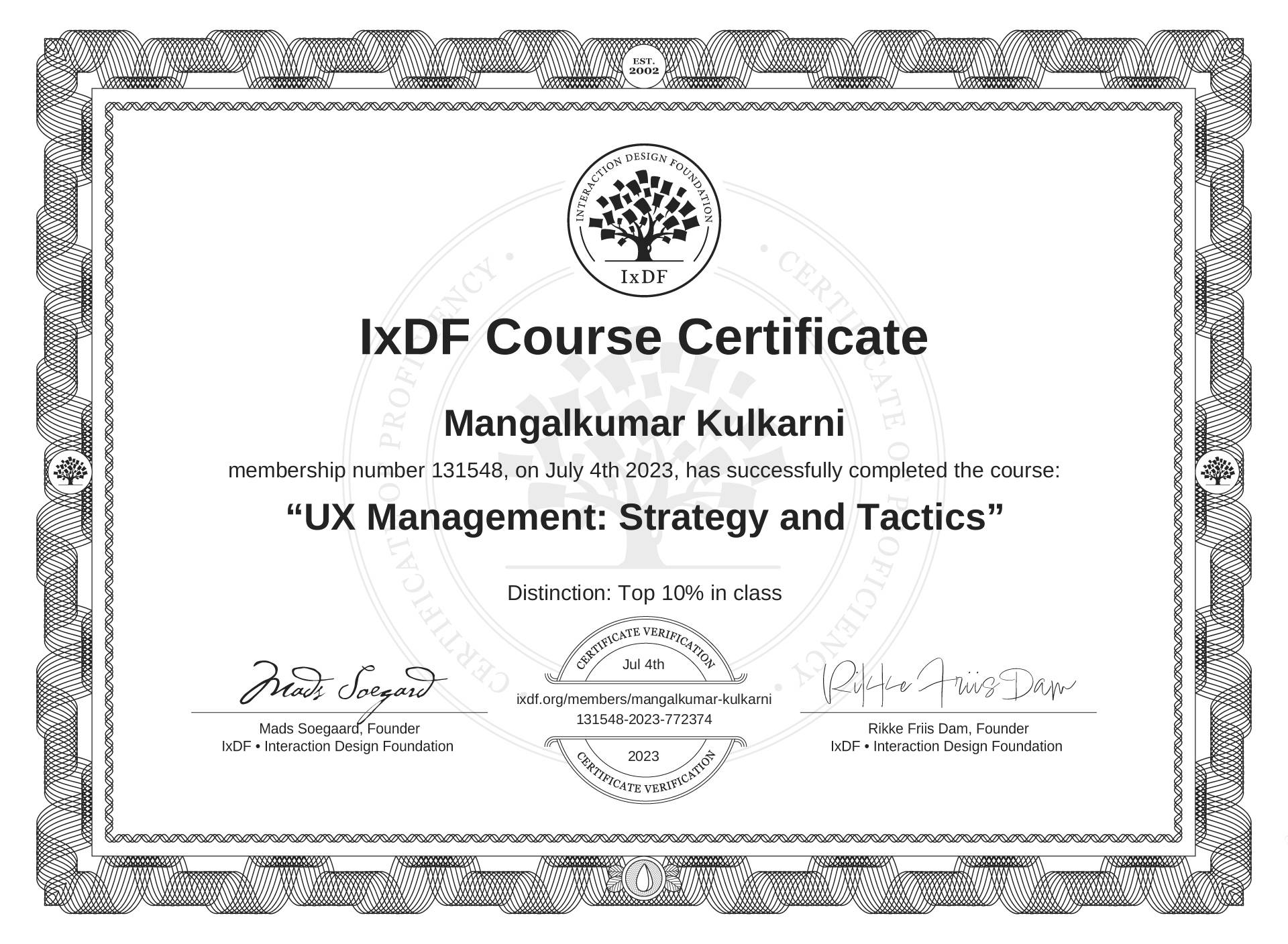 The IxDF Course Certificate (ID #2758d494-4b69-4107-9d76-00d64061f03e) above is awarded to Mangalkumar Kulkarni