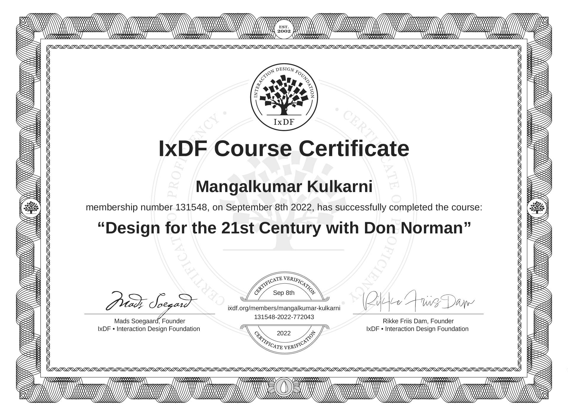 IxDF Course Certificate awarded to Mangalkumar Kulkarni for completing the "Design for the 21st Century with Don Norman" course