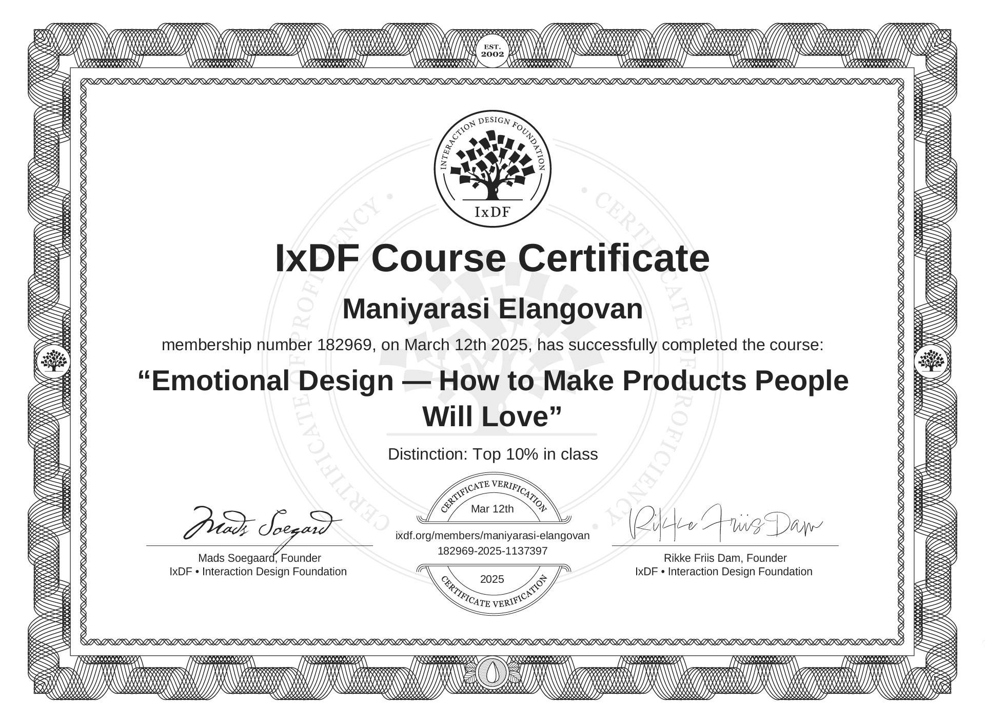 IxDF Course Certificate awarded to Maniyarasi Elangovan for completing the "Emotional Design — How to Make Products People Will Love" course