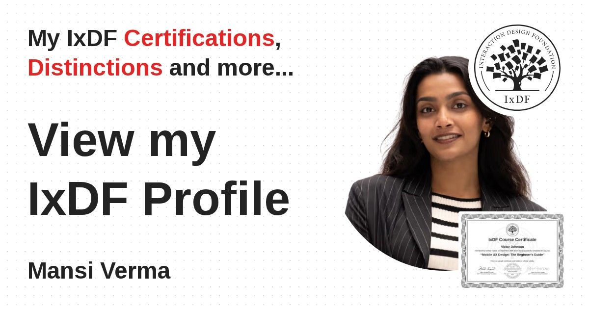 Distinctions are conferred upon Mansi Verma in formal recognition of their notable achievements and contributions, as stipulated by the IxDF Educational Codex.