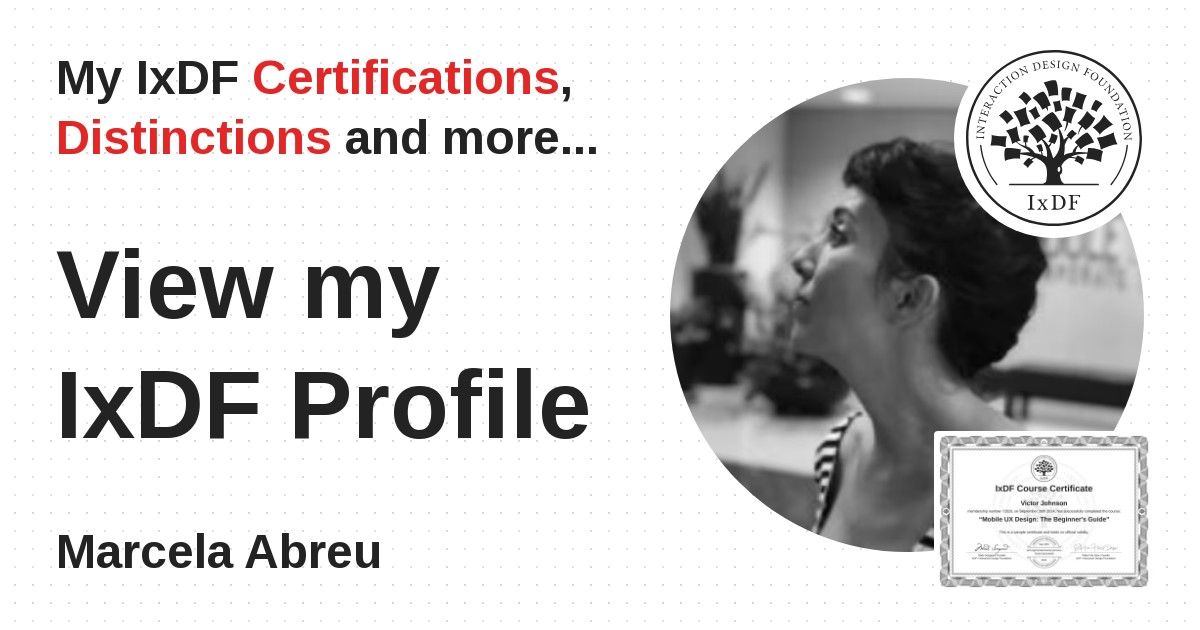 IxDF Course Certificates are awarded to Marcela Abreu in formal recognition of their coursework surpassing the rigorous benchmarks of exceptional performance established by the IxDF Educational Codex.