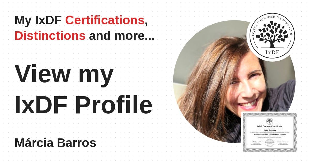 IxDF Course Certificates are awarded to Márcia Barros in formal recognition of their coursework surpassing the rigorous benchmarks of exceptional performance established by the IxDF Educational Codex.