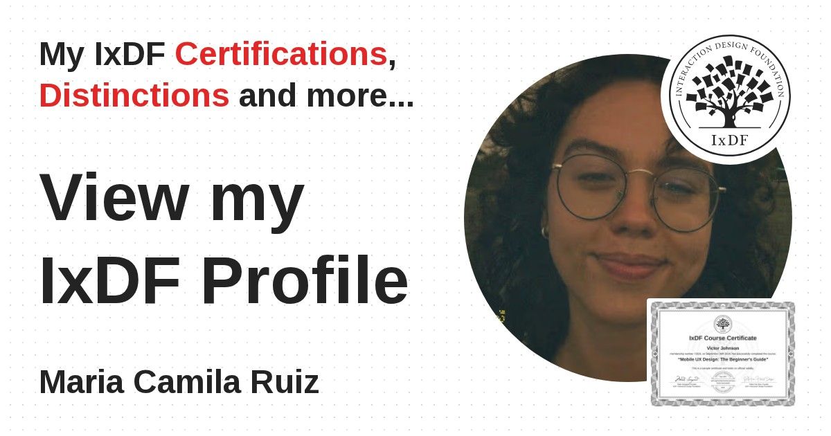 IxDF Course Certificates are awarded to Maria Camila Ruiz in formal recognition of their coursework surpassing the rigorous benchmarks of exceptional performance established by the IxDF Educational Codex.