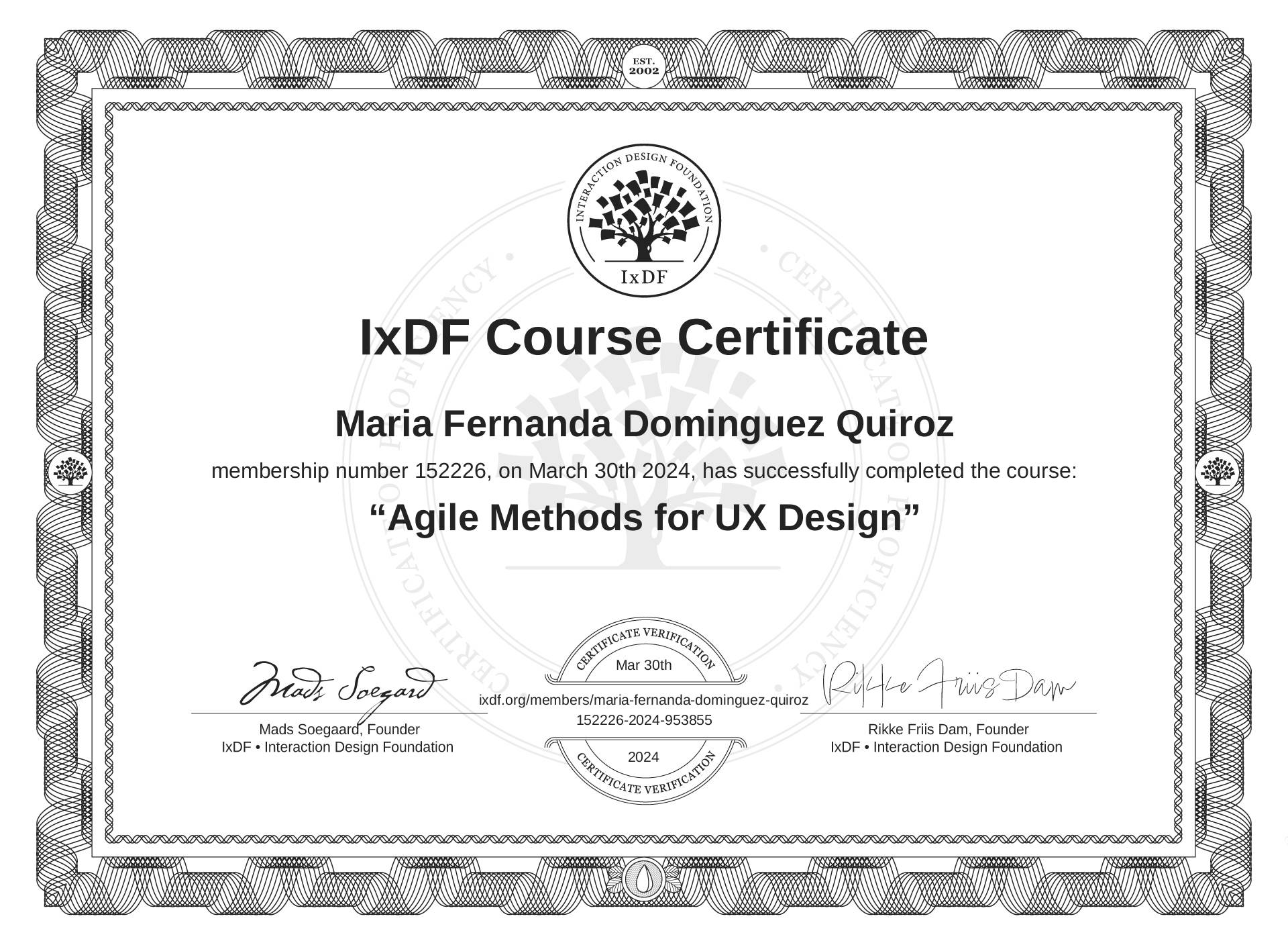 IxDF Course Certificate awarded to María Fernanda Domínguez Quiroz for completing the "Agile Methods for UX Design" course