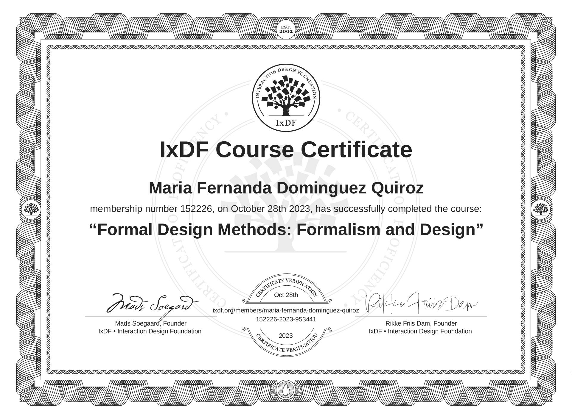 This IxDF Membership Certificate is issued to María Fernanda Domínguez Quiroz