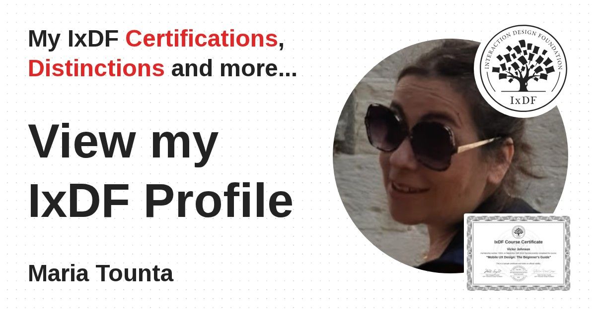 IxDF Course Certificates are awarded to Maria Tounta in formal recognition of their coursework surpassing the rigorous benchmarks of exceptional performance established by the IxDF Educational Codex.