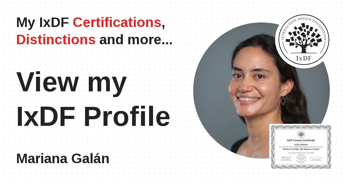 IxDF Course Certificates are awarded to Mariana Galán in formal recognition of their coursework surpassing the rigorous benchmarks of exceptional performance established by the IxDF Educational Codex.