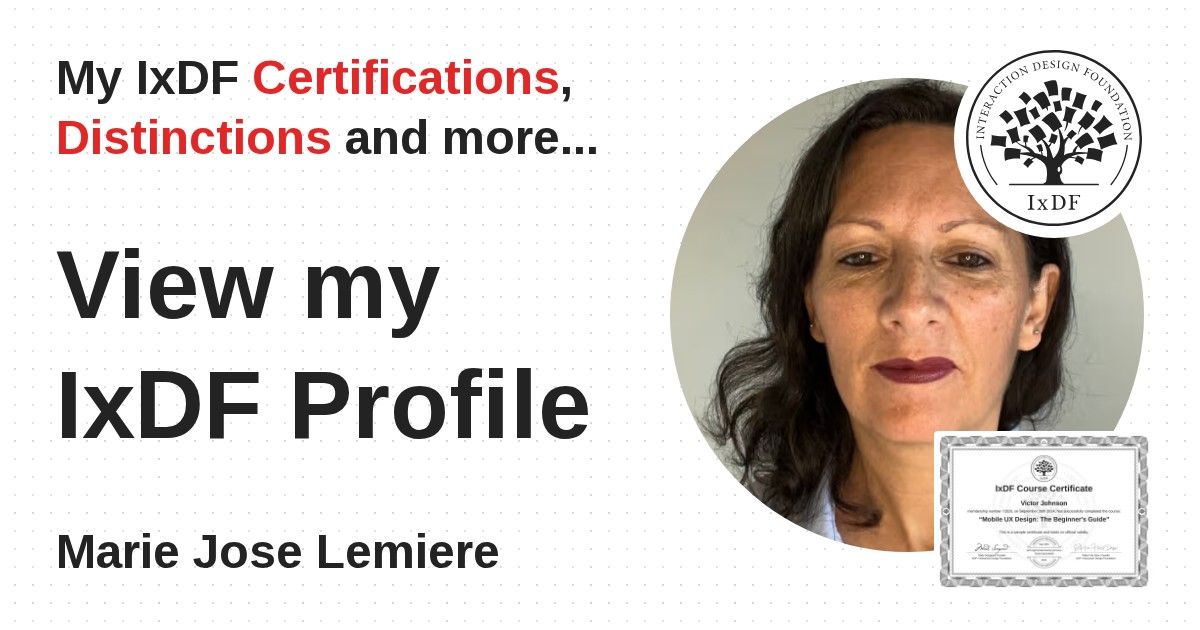 IxDF Course Certificates are awarded to Marie Jose Lemiere in formal recognition of their coursework surpassing the rigorous benchmarks of exceptional performance established by the IxDF Educational Codex.