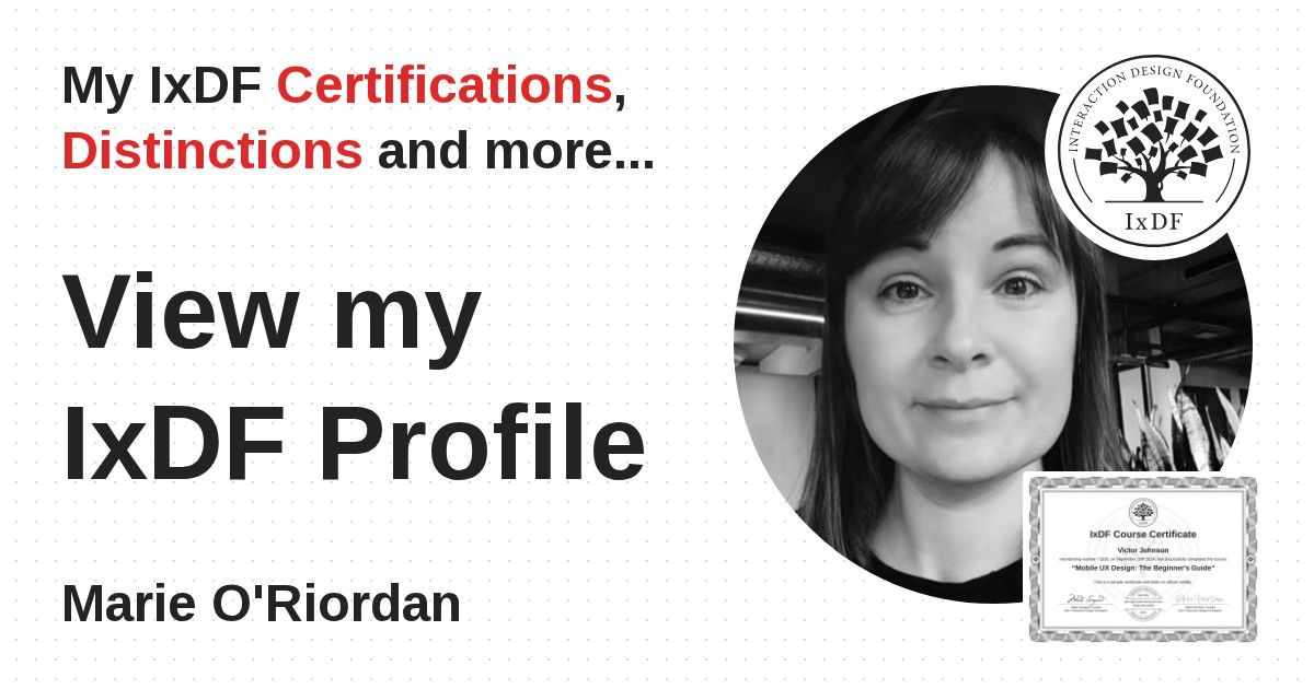 IxDF Course Certificates are awarded to Marie O'Riordan in formal recognition of their coursework surpassing the rigorous benchmarks of exceptional performance established by the IxDF Educational Codex.
