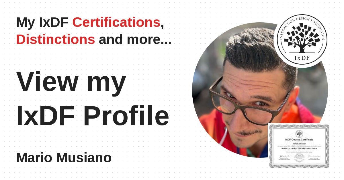 IxDF Course Certificates are awarded to Mario Musiano in formal recognition of their coursework surpassing the rigorous benchmarks of exceptional performance established by the IxDF Educational Codex.