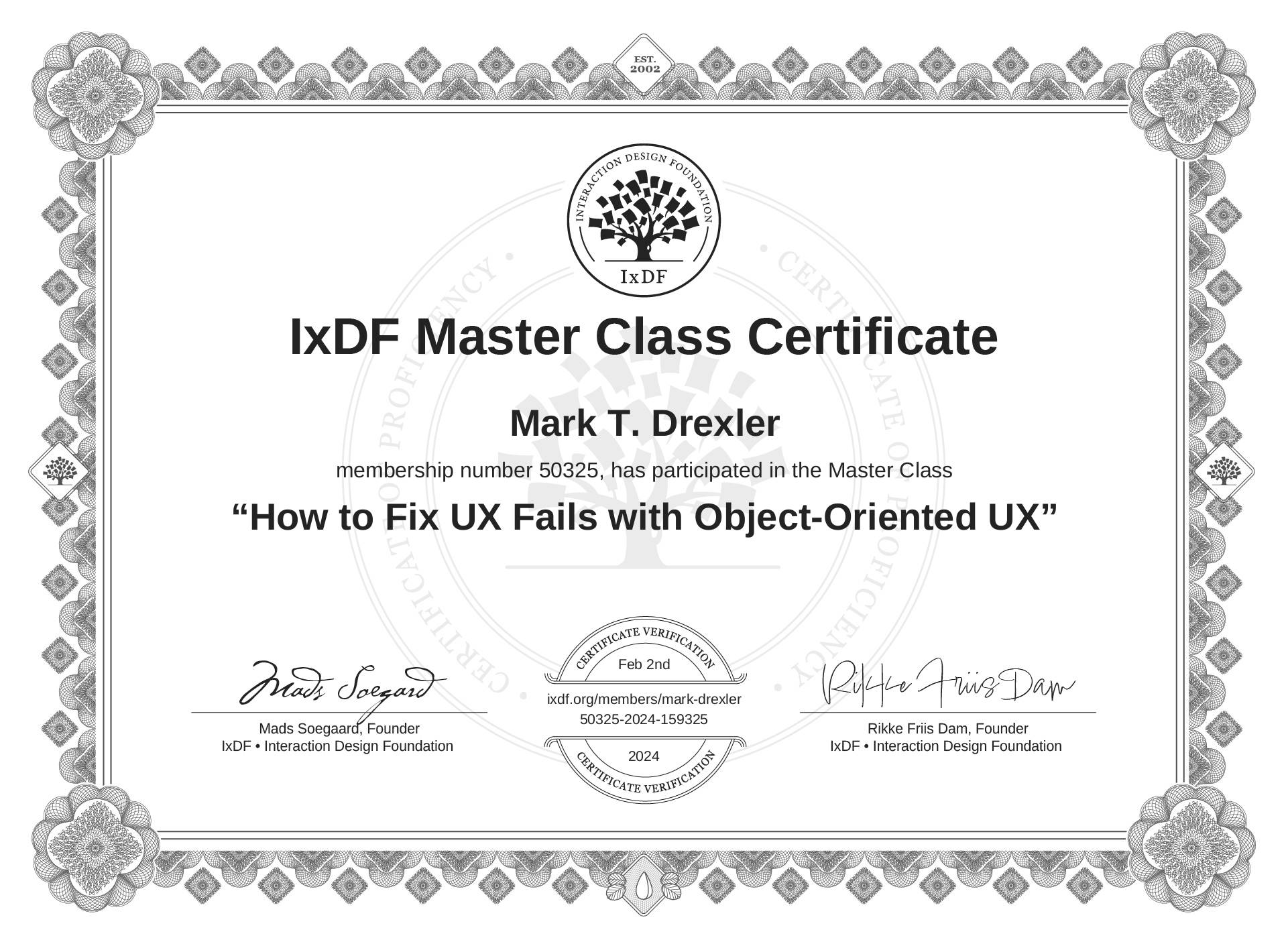 The IxDF Master Class Certificate (ID #mcc_bef59b98ebef4b549291a82b53824104) above is awarded to Mark T. Drexler in formal recognition of their participation in the Master Class How to Fix UX Fails with Object-Oriented UX .