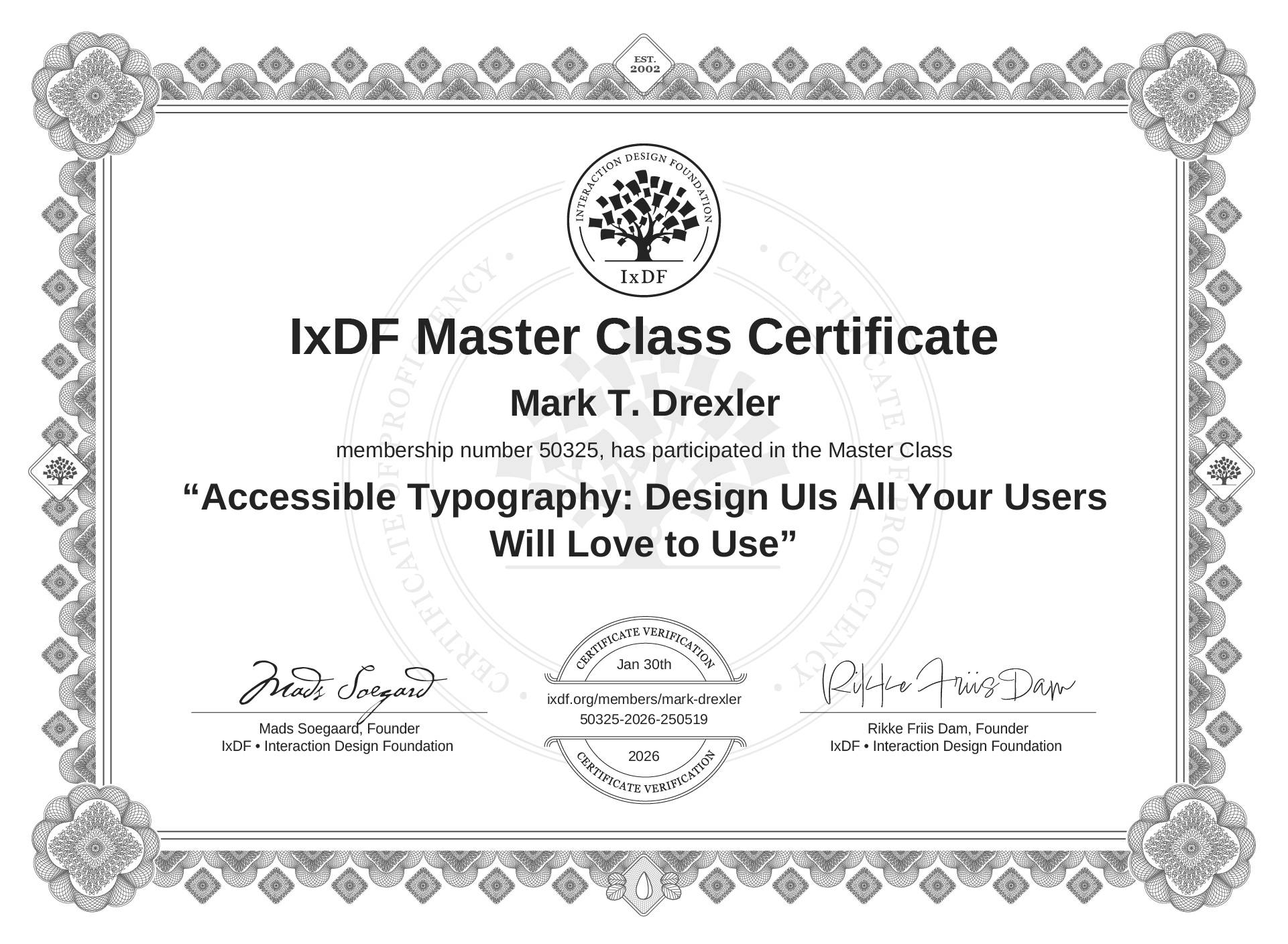 The IxDF Master Class Certificate (ID #mcc_f68b9eb7406e46c9af05ee3bf0206b12) above is awarded to Mark T. Drexler in formal recognition of their participation in the Master Class Accessible Typography: Design UIs All Your Users Will Love to Use .