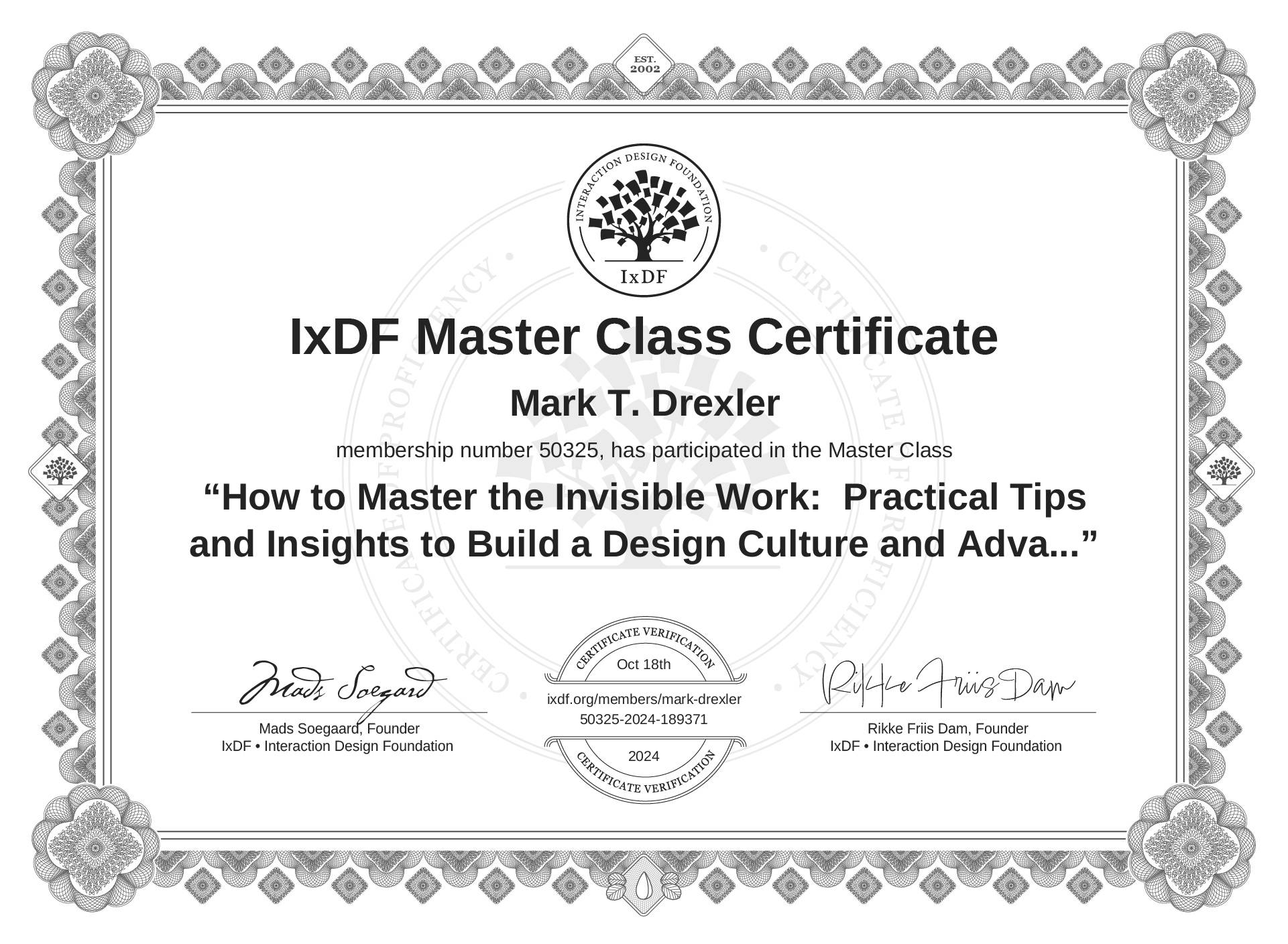 The IxDF Master Class Certificate (ID #mcc_ff7ac195e4d8476ab4dd256e9221b8ef) above is awarded to Mark T. Drexler in formal recognition of their participation in the Master Class How to Master the Invisible Work: Practical Tips and Insights to Build a Design Culture and Advance Your Career .