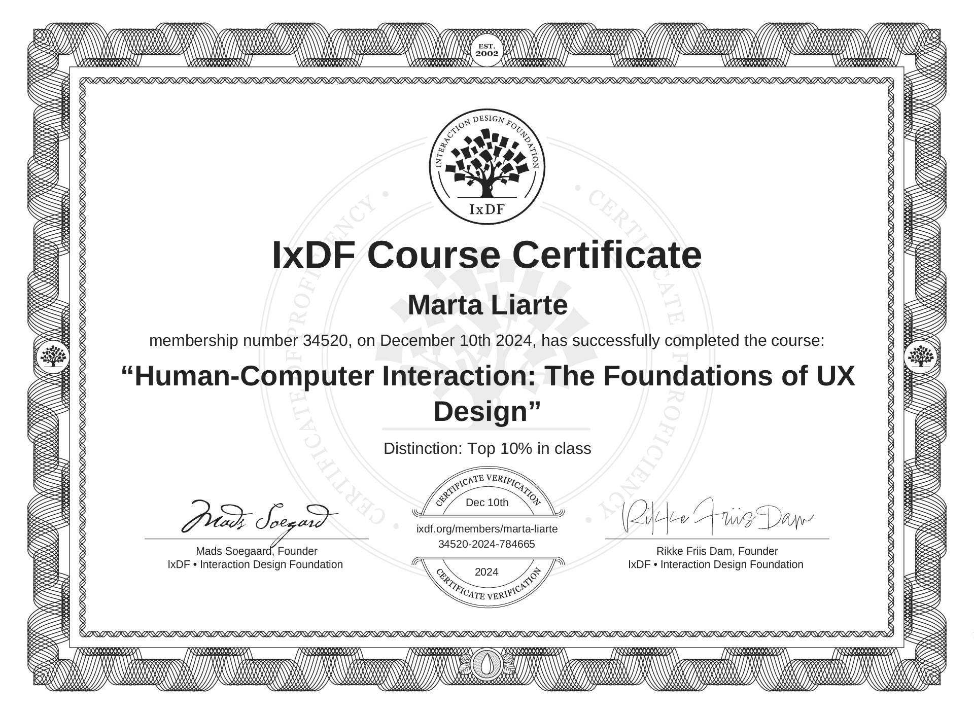 IxDF Course Certificates are awarded to Marta Liarte in formal recognition of their coursework surpassing the rigorous benchmarks of exceptional performance established by the IxDF Educational Codex.