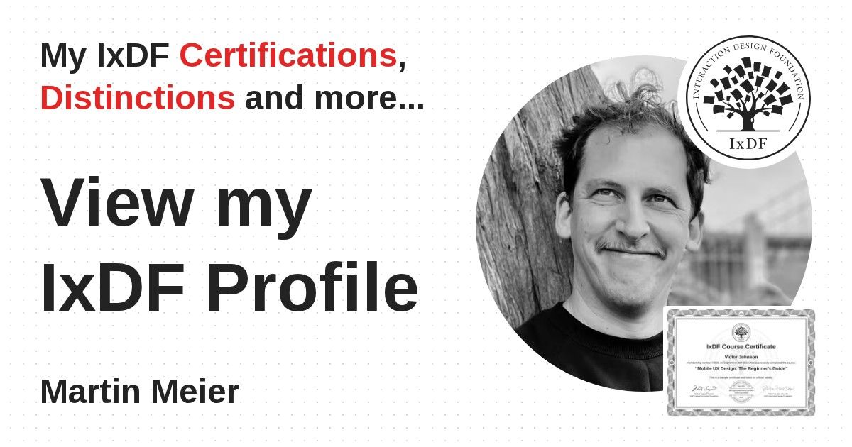 IxDF Course Certificates are awarded to Martin Meier in formal recognition of their coursework surpassing the rigorous benchmarks of exceptional performance established by the IxDF Educational Codex.