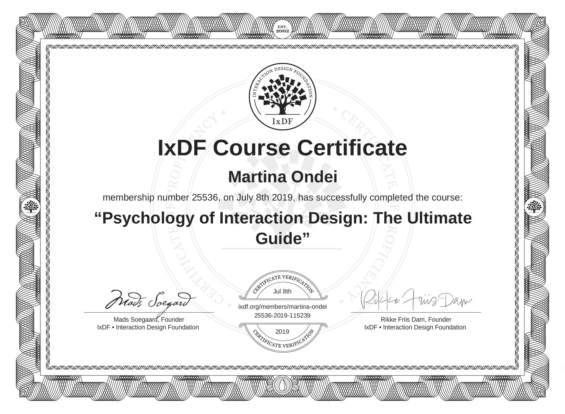 The IxDF Course Certificate (ID #PWflsnzct) above is awarded to Martina Ondei in formal recognition of their coursework surpassing the rigorous benchmarks of exceptional performance established by the IxDF Educational Codex. View Course Curriculum.