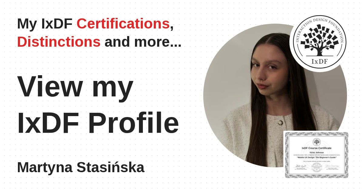 IxDF Course Certificates are awarded to Martyna Stasińska in formal recognition of their coursework surpassing the rigorous benchmarks of exceptional performance established by the IxDF Educational Codex.