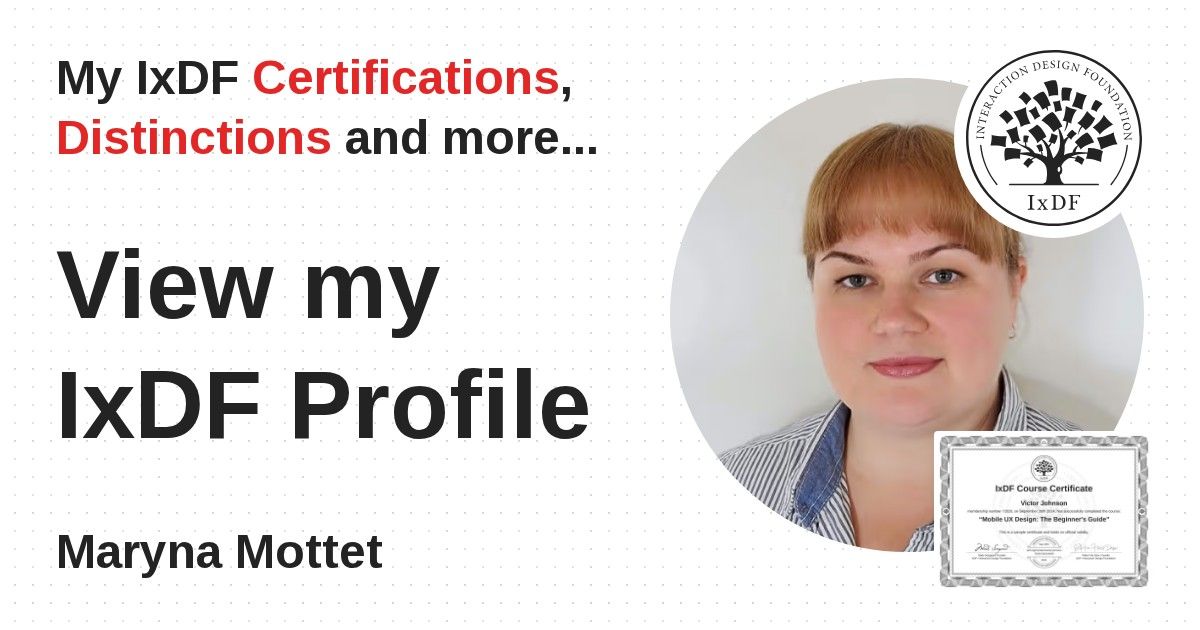 IxDF Course Certificates are awarded to Maryna Mottet in formal recognition of their coursework surpassing the rigorous benchmarks of exceptional performance established by the IxDF Educational Codex.