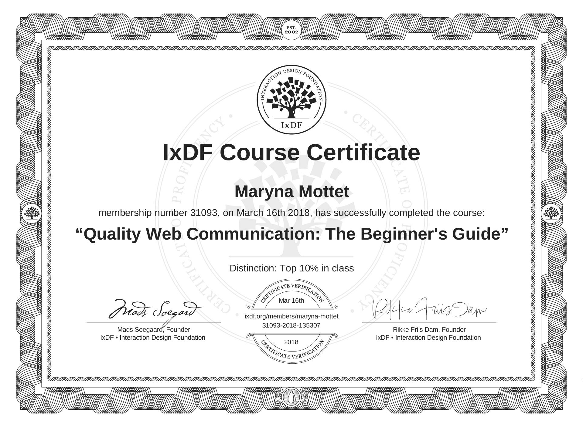 Maryna Mottet's Course Certificate: Quality Web Communication: The Beginner's Guide