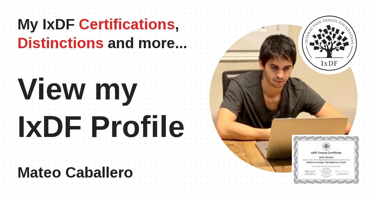 IxDF Course Certificates are awarded to Mateo Caballero in formal recognition of their coursework surpassing the rigorous benchmarks of exceptional performance established by the IxDF Educational Codex.