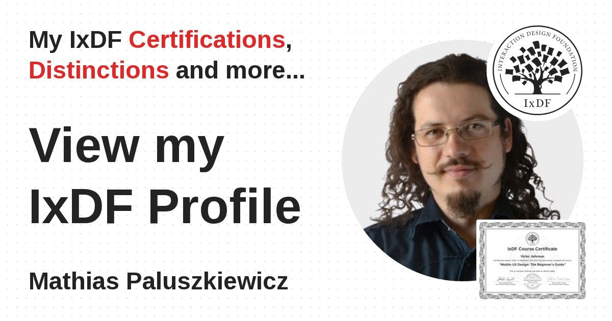 IxDF Course Certificates are awarded to Mathias Paluszkiewicz in formal recognition of their coursework surpassing the rigorous benchmarks of exceptional performance established by the IxDF Educational Codex.