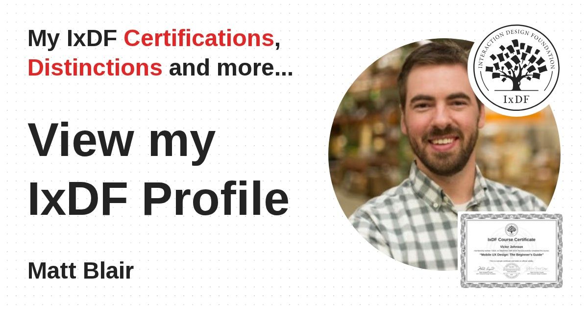 IxDF Course Certificates are awarded to Matt Blair in formal recognition of their coursework surpassing the rigorous benchmarks of exceptional performance established by the IxDF Educational Codex.