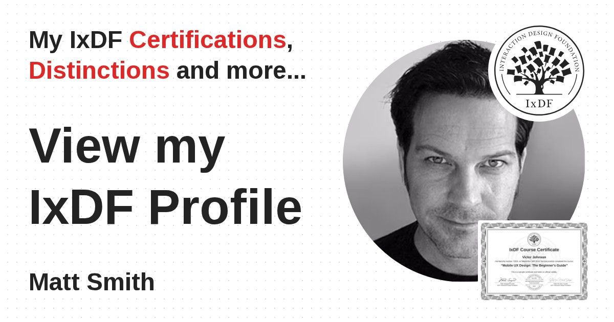 IxDF Course Certificates are awarded to Matt Smith in formal recognition of their coursework surpassing the rigorous benchmarks of exceptional performance established by the IxDF Educational Codex.
