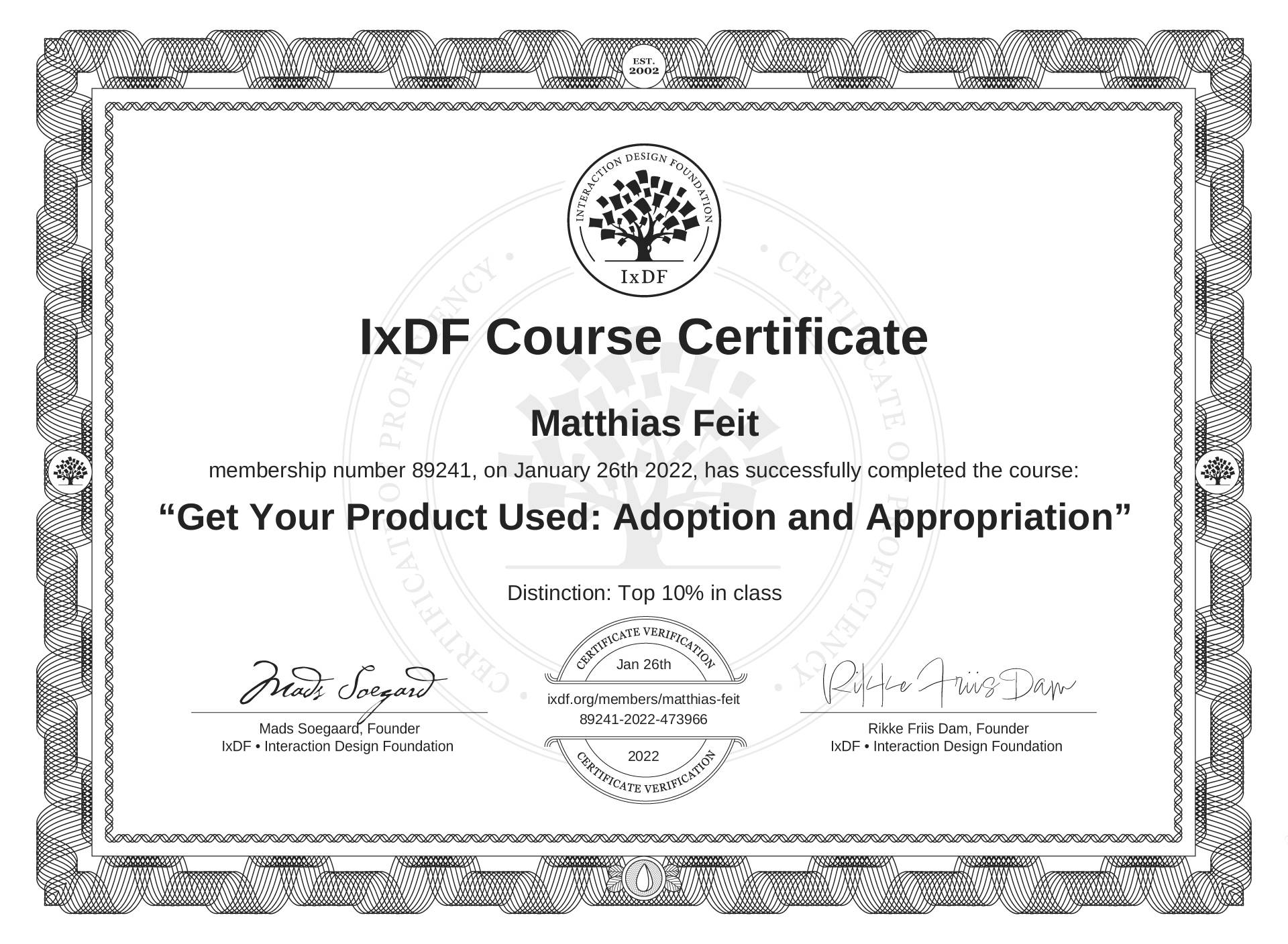 The IxDF Course Certificate (ID #320b1e79-f65c-4241-ac6e-169161351319) above is awarded to Matthias Feit