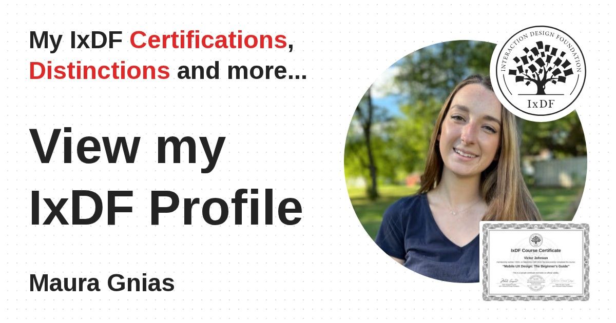 IxDF Course Certificates are awarded to Maura Gnias in formal recognition of their coursework surpassing the rigorous benchmarks of exceptional performance established by the IxDF Educational Codex.