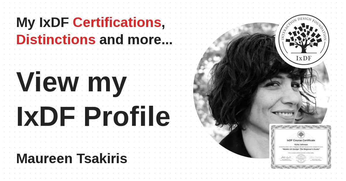 IxDF Course Certificates are awarded to Maureen Tsakiris in formal recognition of their coursework surpassing the rigorous benchmarks of exceptional performance established by the IxDF Educational Codex.