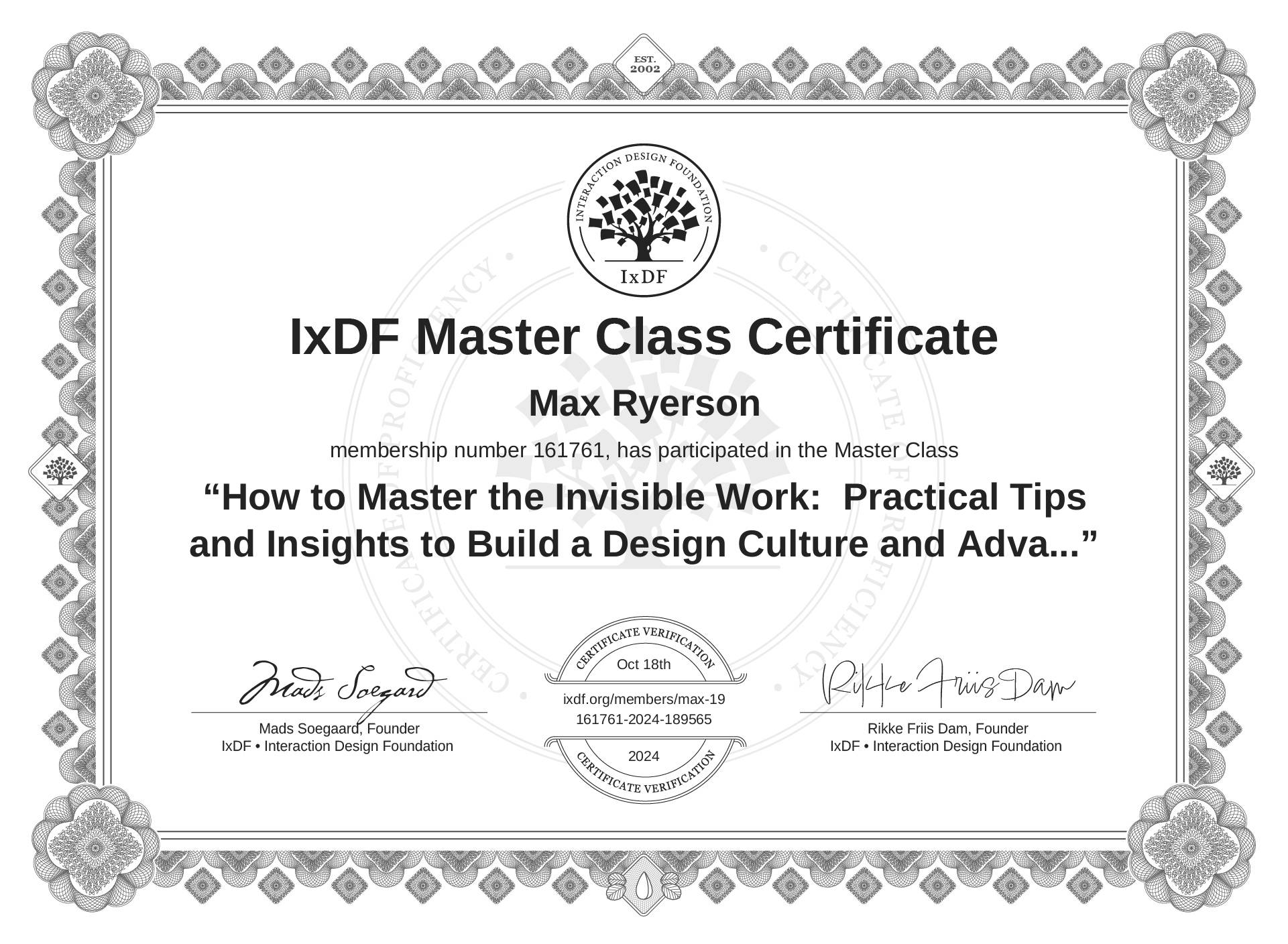 IxDF Master Class Certificates are awarded to Max Ryerson in formal recognition of their attendance and ongoing commitment to learning from industry leaders.