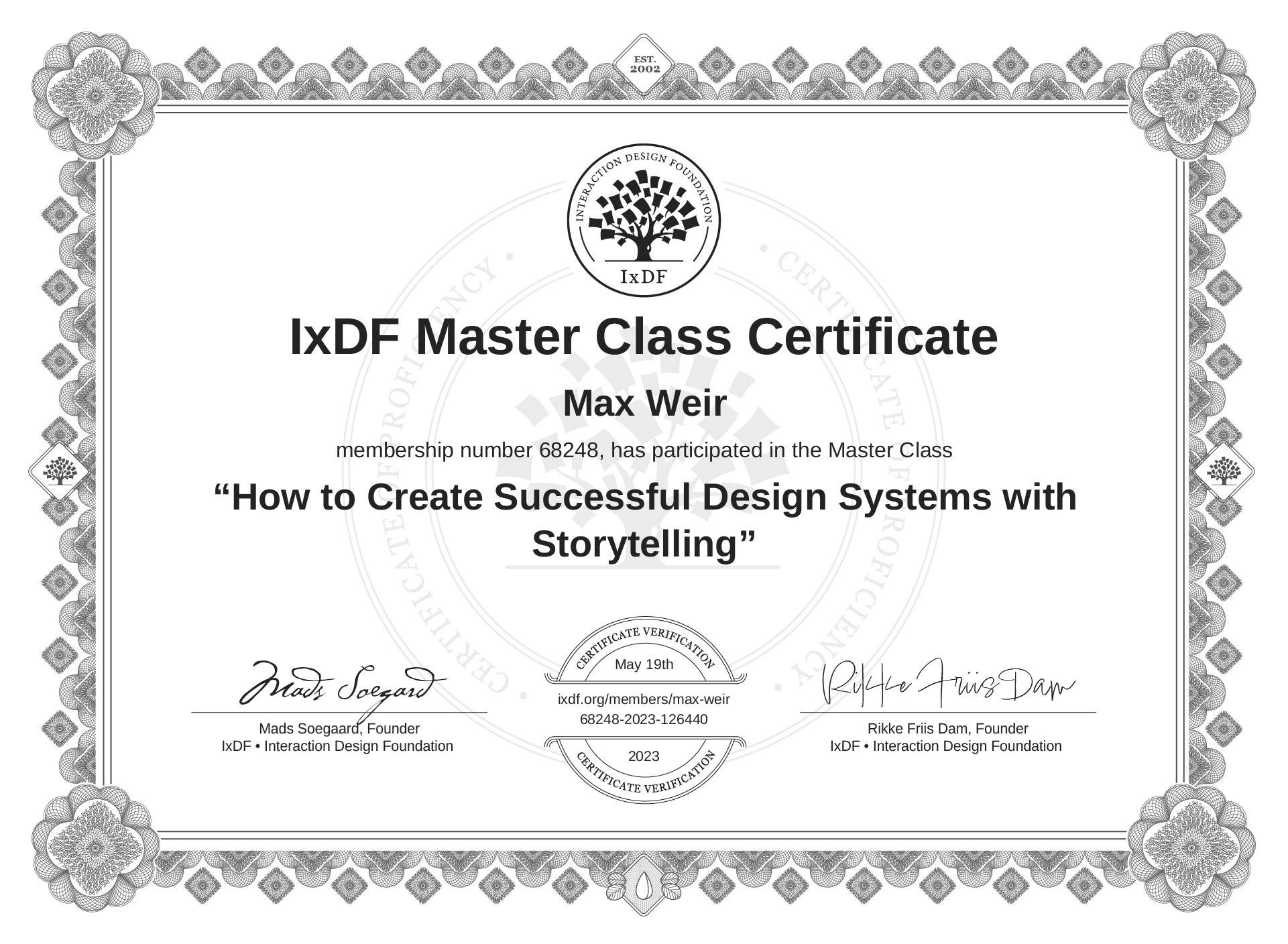 IxDF Master Class Certificates are awarded to Max Weir in formal recognition of their attendance and ongoing commitment to learning from industry leaders.